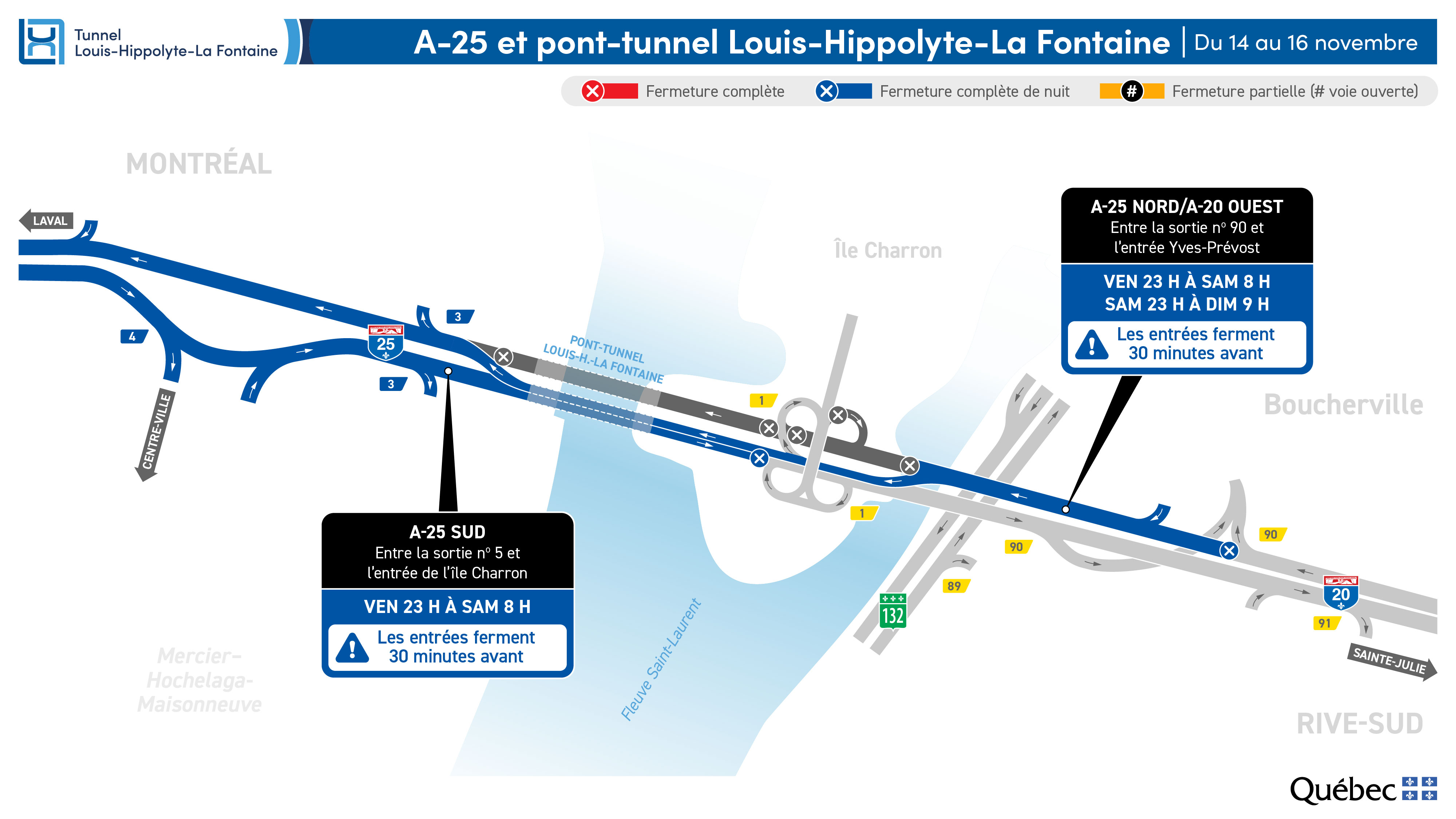 Aussi, l’autoroute 25 en direction de Montréal (incluant le tunnel Louis-Hippolyte-La Fontaine) entre la sortie n° 90 (autoroute 20 ouest, route 132, La Prairie, USA, Varennes, aéroport P.‑E.‑Trudeau) et l’entrée en provenance du boulevard Yves-Prévost sera complètement fermée de la nuit de ce vendredi à ce samedi, de 23 h à 8 h et de ce samedi à ce dimanche de 23 h à 9 h. « Les entrées de ce tronçon seront fermées 30 minutes avant la fermeture complète de l’autoroute ».